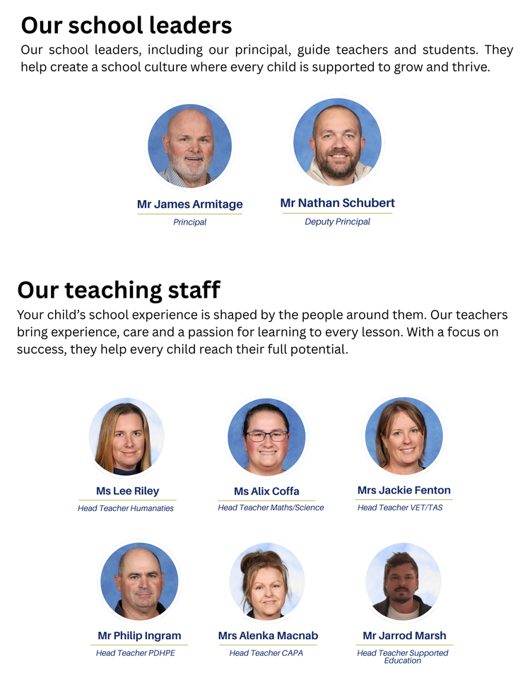 Our school team is dedicated to fostering a supportive and inclusive environment for all students. We prioritise each student's academic progress, recognising individual needs and learning styles. The team actively promotes mental and physical health, ensuring resources and programs are accessible. Furthermore, we cultivate a strong sense of community through collaborative activities and open communication. These efforts build a positive school culture where everyone feels valued and respected.